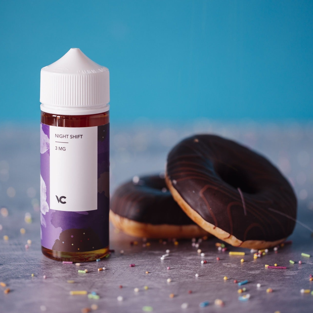 A coffee vape finally done right and in a class of its own. Night Shift is an intriguing blend of rich, dark roast coffee and a semi-sweet chocolate glazed donut, topped with a hint of velvet cream that adds just the right amount of depth, thickness, and complexity.